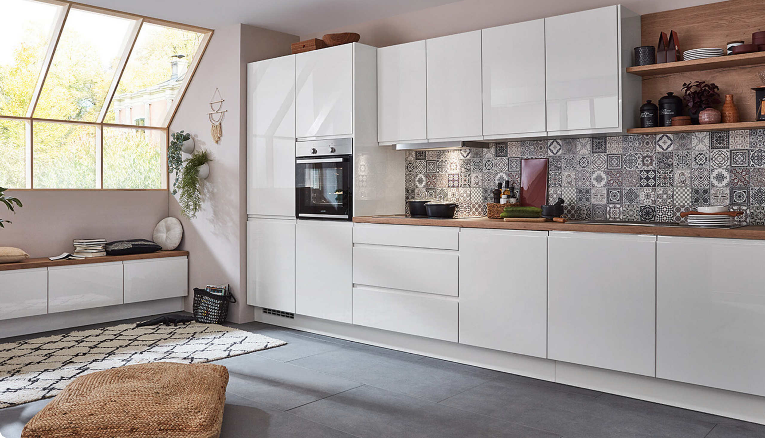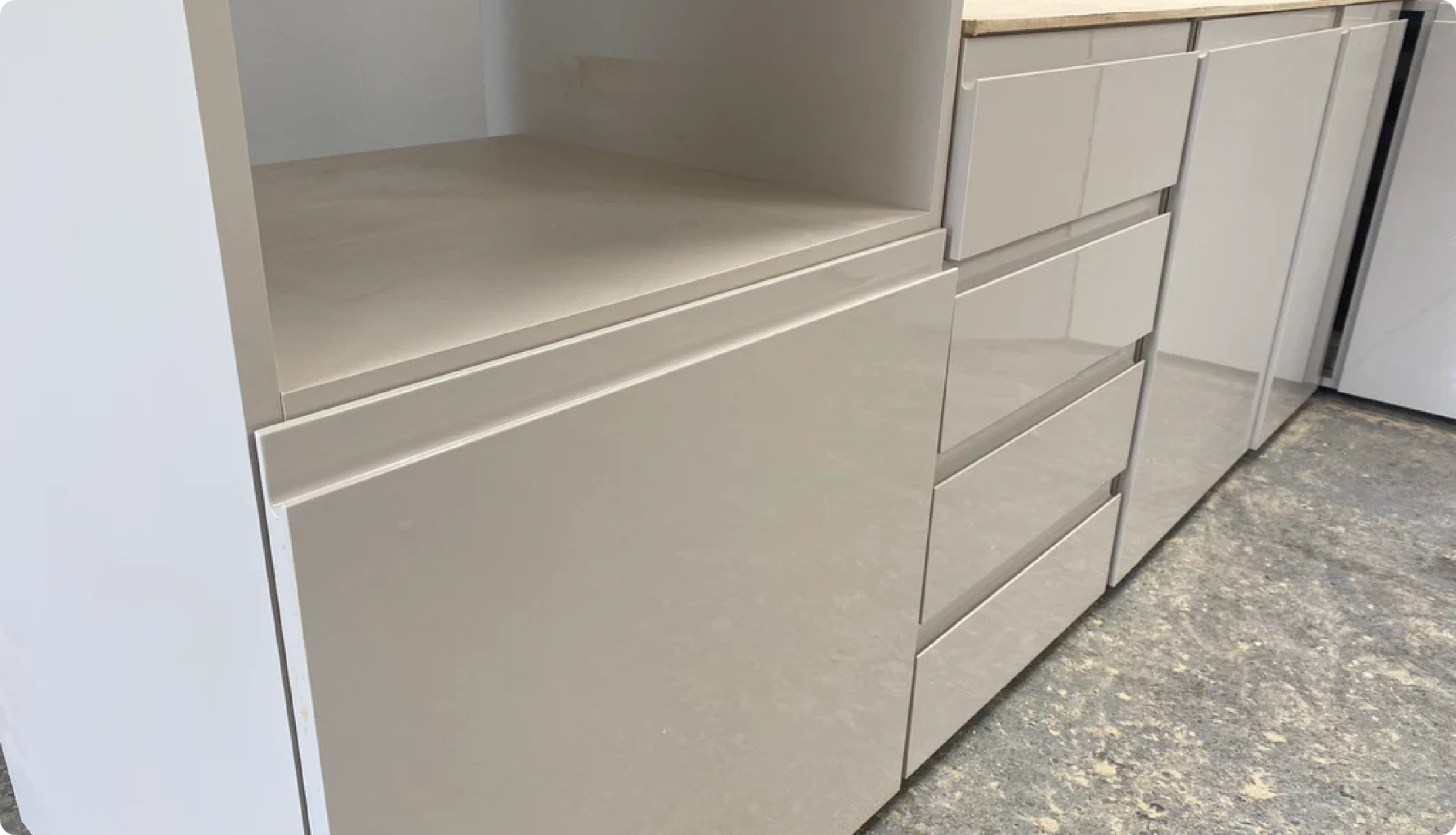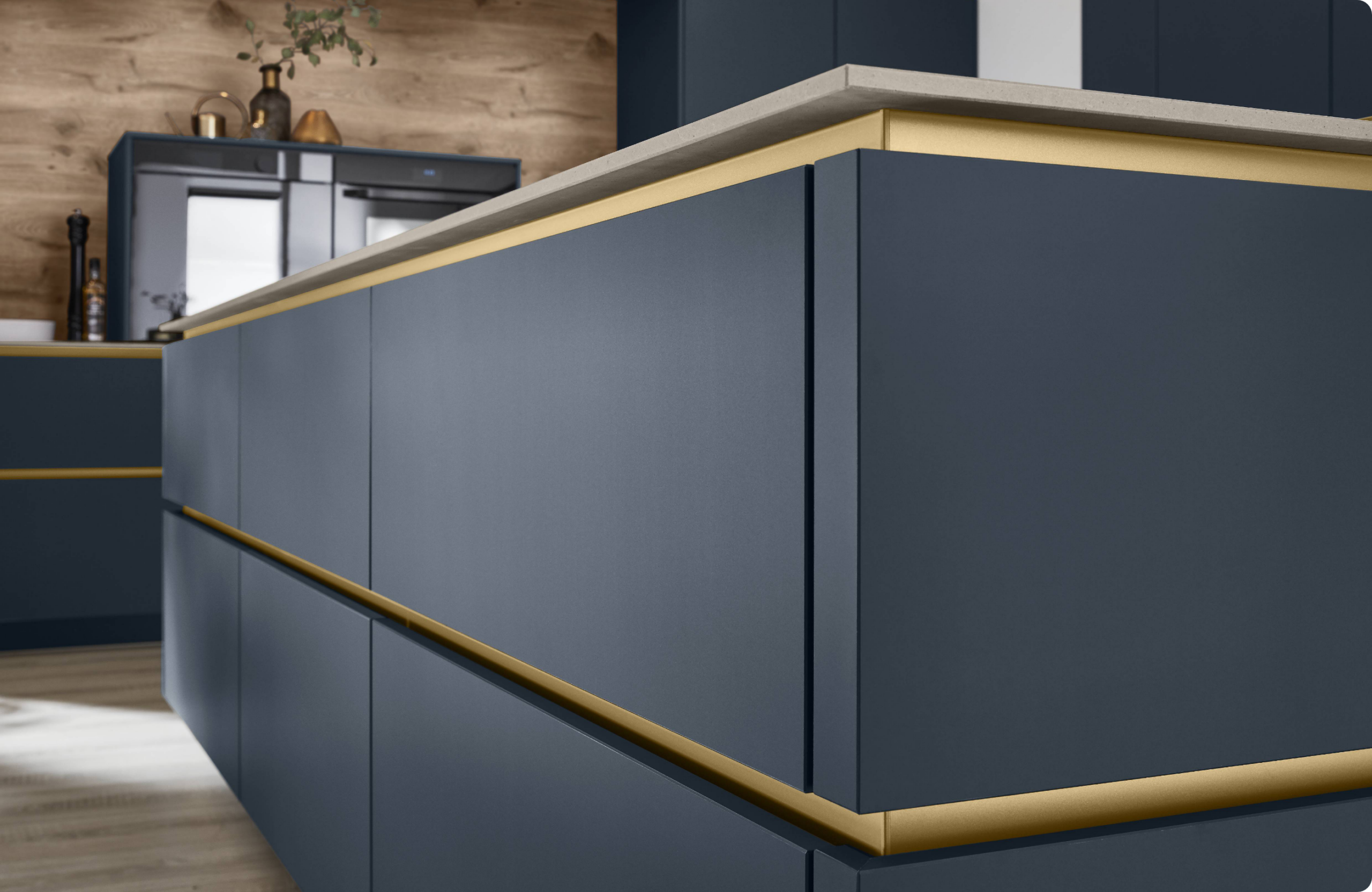 A true handleless kitchen features a linear railing system that is directly fixed to the cabinet in front of which the cabinet door is mounted thus eliminating the need for any protruding handles. The best manufacturers can produce this railing system in up to 5.1 metre lengths. Why is that important? Having such long lengths available means one long rail can be fitted right along the entire length of a run of base or floor cabinets without the need for any joints, please see image. It looks sleek and sophisticated. Another benefit of having a 5.1 metre length available is when it comes to the tall cabinets in a kitchen. The railing system can be mounted vertically behind the doors of any tall cabinet such as a larder unit, oven housing or fridge/freezer housing. Yet another instance where true handleless comes into its own. It is sleek, sophisticated, and, dare we say, sexy!